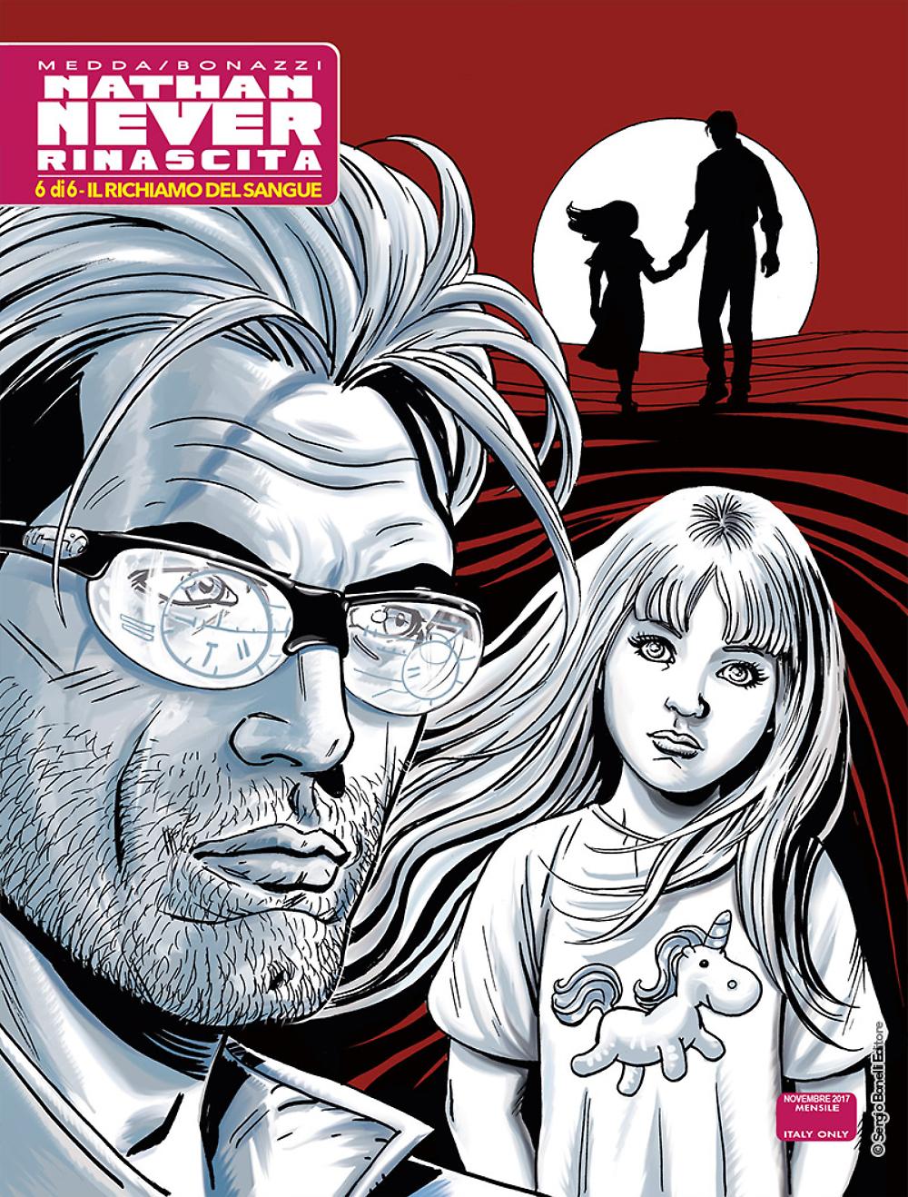 Oltre questo, vanno sottolineate la più che buona valorizzazione del fascino di Legs e la “geekness” di Sigmund, che in molti casi rischia di andare un po’ troppo sopra le righe. In ultimo, va segnalata la già ampiamente riconosciuta nel tempo abilità nel descrivere l’action e la violenza: Bonazzi è sempre rapido, disincantato e puntuale, mai eccessivo. Il “solito” discorso sulla tenuta di un livello qualitativo più o meno standard lungo un arco di 500 e passa tavole, sebbene corretto da un punto di vista di puro giudizio, presenta comunque un sapore di critica gratuita. Bonazzi ha caratterizzato Nathan in pratica sin dagli esordi (come De Angelis), e il suo tratto ha avuto flessioni tanto verso l’alto quanto verso il basso in questo primo quarto di secolo del personaggio. Non è nuovo a tour de force come questo, avendo messo mano anche ai Giganti (sempre come De Angelis). Volendo al limite paragonare queste “magna opera”, si può azzardare l’ipotesi che i toni ben diversi delle due narrazioni (da un lato Nathan/Nemo, dall’altra Nathan e basta) abbiano influenzato il “sentire” dell’autore nei confronti del lavoro da realizzare, offrendo pertanto due declinazioni tanto diverse quanto correlabili – il tutto ovviamente senza tenere conto del tempo trascorso tra l’una e l’altra pubblicazione. È invece interessante spendere due parole sulla cover art: al puzzle della prima mini succede una parata di volti di Nathan che sottolinea: a) l’evoluzione della vicenda attraverso richiami ad elementi particolari (sebbene la cover del n.3 appaia leggermente off topic) e b) l’evoluzione della vicenda sullo stesso Nathan, sul cui volto appaiono progressivamente i segni della sofferenza, della rabbia, della speranza, della ricerca di un sollievo. È dunque anche questo un espediente di valore, che parte da un presupposto diverso da quello precedente, e per questo è parimenti apprezzabile.