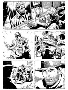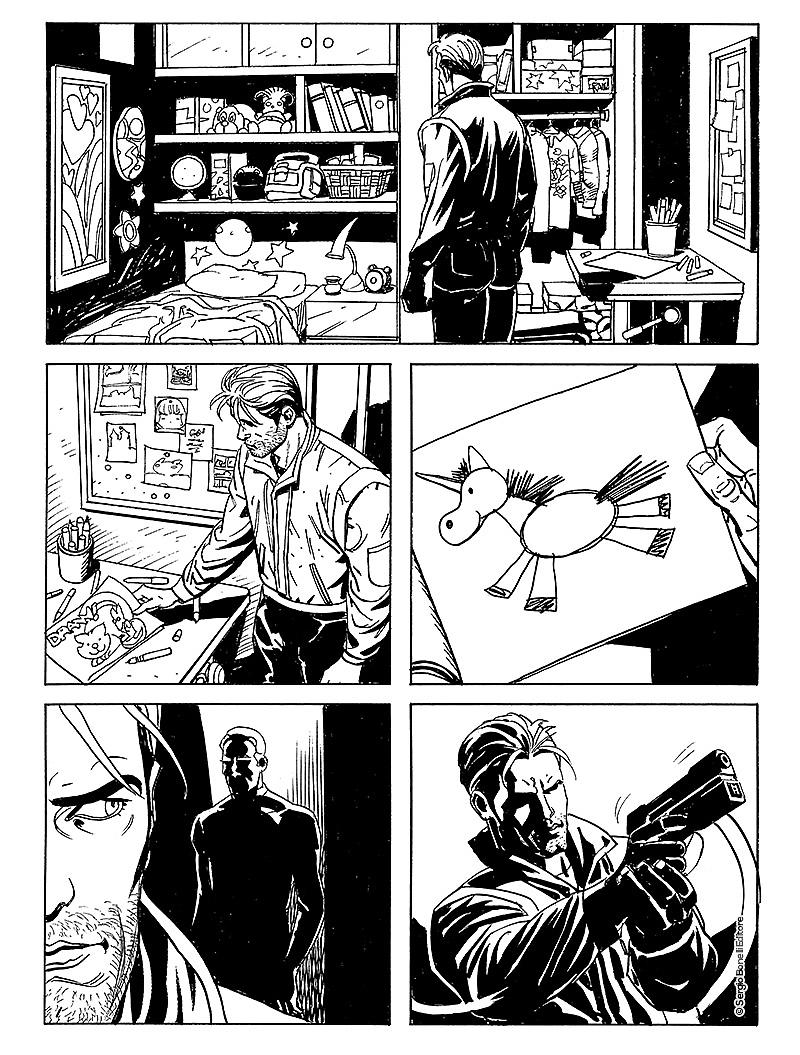 Il tratto di Bonazzi, ben distante dalle linee intime e cupe di De Angelis, lavora in sintonia con i testi nella definizione dell’hard boiled classico e, forse, la sua caratterizzazione dei personaggi può servire da bussola emotiva per aiutare il lettore a districarsi nell’animo della vicenda. La figura di Nathan in primis è ieratica, dura e impassibile per la maggior parte della storia. Se contrapposto alla sua nemesi, Mace, quest’ultimo ne risulta quasi più umano. Il dolore di Nathan è espresso tutto nella cieca ricerca di Ann, quasi non ci sia spazio per altro, e questo Bonazzi lo rende perfettamente, fino alla rottura nell’ultimo albo, a pagina 64. Di contro, Mace è folle, passionale, sadico e crudele, ma anche assurdamente legato ad Ann – e, come detto, distortamente ricambiato. La dicotomia tra i due meriterebbe un’analisi a sé.