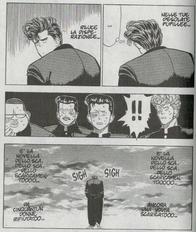 Immagini che, a loro volta, urlano “passione” ad ogni microgrammo di pigmento posato. Lo stile di Boichi, tendente ad un “realistico-estetico” di nuovo accomunabile tanto ad Ikegami che ad Hara, descrive anatomie perfette ed apollinee quasi sempre tese all’azione. Se i personaggi sono nudi o seminudi abbiamo un tripudio di muscoli in tensione ed articolazioni dettagliate, quando sono vestiti allora quasi sempre è un panneggio di completi di gran marca ed uno svolazzo di code di trench ed impermeabili. Le coreografie di combattimento, punto forte di un manga d’azione, sono curate al dettaglio, cariche ed esplosive: complice anche la follia (qui, andiamo oltre la “passione”) dell’autore che si è cimentato, lui ed i suoi assistenti, nel tentare di “riprendere dal vivo” i movimenti che avrebbe poi disegnato; con risultati testimoniati dalle fotografie incluse nei volumi che variano tra l’esibizione di arti marziali, i blooper di un film di Jackie Chan e una recita di ubriachi. A questo si unisce una matura comprensione di quelli che sono i ritmi e le potenzialità della tavola, sfruttate senza alcuna economia in una mitraglia di dettagli, primi-piani, campi lunghi ed immagini sovrapposte, rotte solo dall’occasionale vignetta “super-deformed” che alleggerisce il tono e restituisce un po’ di umanità (grezza, umanità) al protagonista ed ai suoi eroici compari.