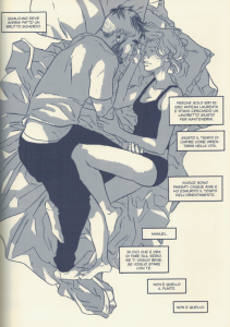 Dal punto di vista del disegno, forse non sono il recensore più adatto per giudicare, vista la mia frequentazione assidua con il lontano oriente, ma certamente la capacità dell’autrice, affinata con perseveranza nelle autoproduzioni, si percepisce tutta. Chine e mezzi toni sono stesi con un tratto personale e sicuro. Le anatomie sono armoniche ed improntate ad un “realismo chiaro” di matrice nostrana. Le azioni scorrono inquadrate in una ripartizione classica per il fumetto occidentale moderno ed il tema “slice of life” impone per lo più soluzioni di inquadratura medie. Poi, un po’ per “sgranchirsi”, approfittando degli inserti narrativi presi dal libro di Manuel, l’autrice introduce qualche tavola di più ampio respiro, ma senza strafare.