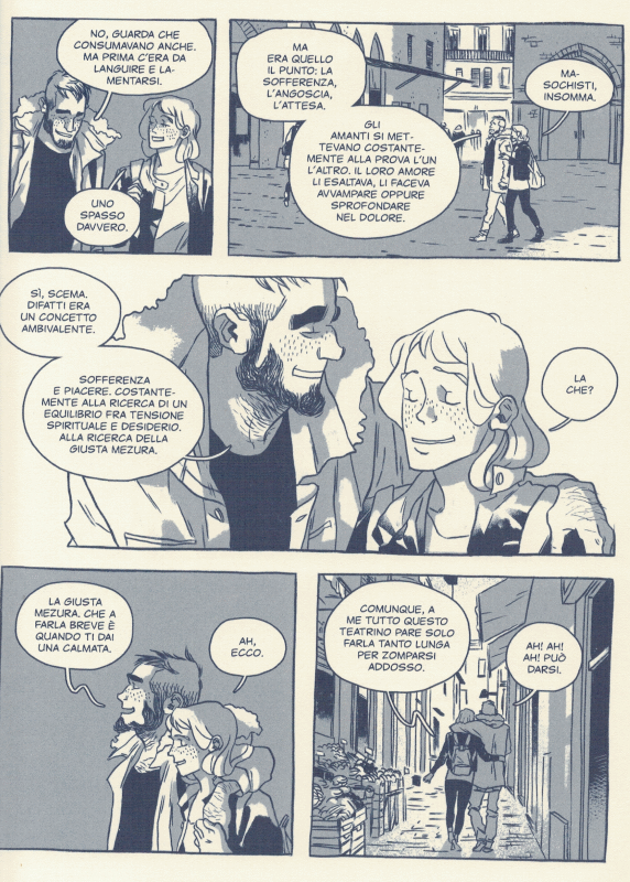 Dal punto di vista del disegno, forse non sono il recensore più adatto per giudicare, vista la mia frequentazione assidua con il lontano oriente, ma certamente la capacità dell’autrice, affinata con perseveranza nelle autoproduzioni, si percepisce tutta. Chine e mezzi toni sono stesi con un tratto personale e sicuro. Le anatomie sono armoniche ed improntate ad un “realismo chiaro” di matrice nostrana. Le azioni scorrono inquadrate in una ripartizione classica per il fumetto occidentale moderno ed il tema “slice of life” impone per lo più soluzioni di inquadratura medie. Poi, un po’ per “sgranchirsi”, approfittando degli inserti narrativi presi dal libro di Manuel, l’autrice introduce qualche tavola di più ampio respiro, ma senza strafare.