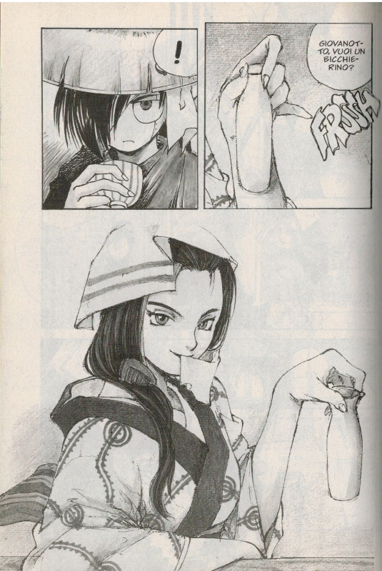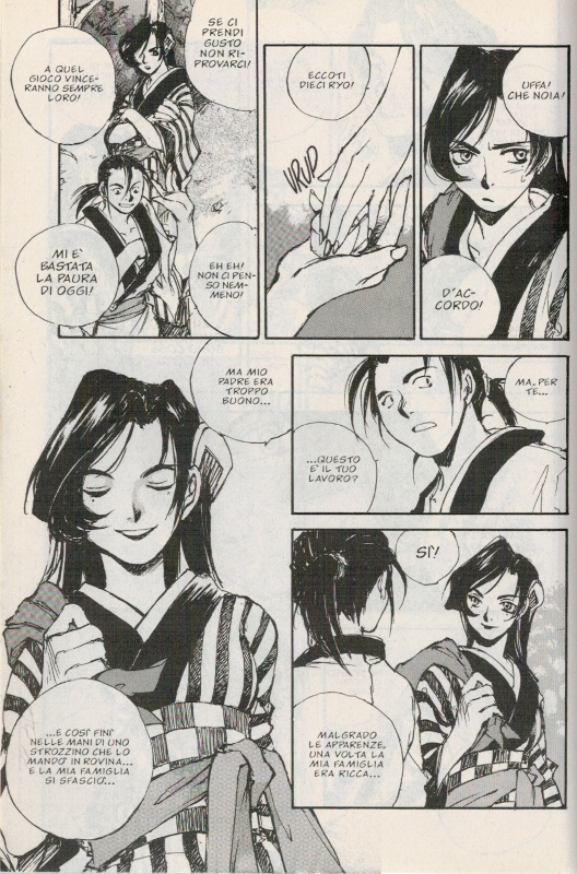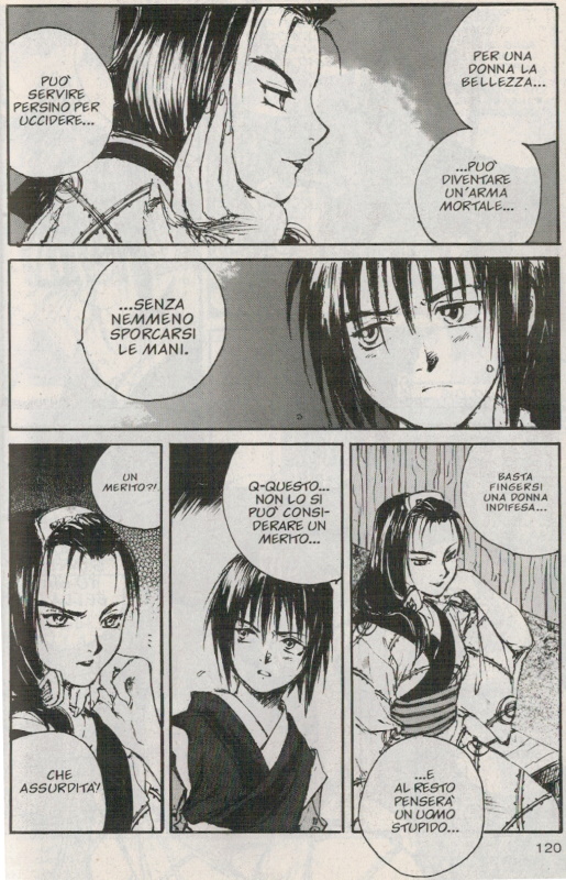 Su questo soggetto si innesta una sceneggiatura che è la firma tipica dell’autrice giapponese ed è, probabilmente, il motivo per cui ci vuole tempo per farsi prendere. Kei Tome infatti è una narratrice “sommessa” ed il lettore resta in effetti estraniato da questo manga presumibilmente d’azione che si prende tutto il tempo per immergerti nella situazione ed in cui i personaggi sono estremamente laconici e, esattamente come in una conversazione, lasciano aleggiare frasi incomplete, troncano la discussione con un gesto pacato o stizzito o, al contrario, trovandosi alla resa dei conti non stanno a menare il can per l’aia e dicono quello che ormai era evidente a tutti con parsimonia di parole. Un manga presunto d’azione in cui i proclami sono assenti, le dichiarazioni altisonanti e gli one-liner nulle e l’azione stessa si risolve in fretta e spesso in maniera inaspettata, conseguenza e non climax di tutta una serie di gesti, parole, ambienti distesi con placida maestria dall’autrice. Dopo di che il protagonista si rimette per strada e forse incontrerà nuovamente, e forse no, i personaggi incrociati nell’episodio.