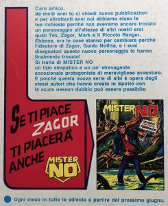 Giugno 1975: dopo gli anni dell’infanzia trascorsi a scroccare fumetti a mio fratello (nonché al mio amico Butch Walts e a suo fratello, in un continuo e disordinato scambio di giornalini), decisi di investire parte della paghetta in un nuovo fumetto con l’intenzione di acquistarlo e collezionarlo personalmente fin dal primissimo numero. Si trattava naturalmente di Mister No, che mi attrasse fin dalle pubblicità circolate nei mesi precedenti sugli altri albi Bonelli: “Se ti piace Zagor, ti piacerà anche Mister No!” Come resistere, vista la mia predilezione per le storie di Guido Nolitta disegnate da Ferri, Donatelli & Bignotti?