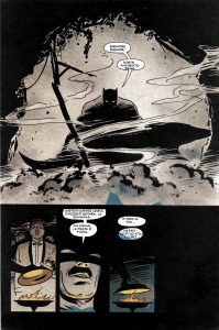 Proprio quest’ultima, nella fattispecie Gotham City, viene sadicamente introdotta dalle riflessioni di Gordon, rigorosamente in didascalie, in questo modo: “Da quassù scorgo soltanto maestosi edifici e grandi distese di cemento. Frutto del sudore di uomini ormai morti da svariate generazioni”. Anche Bruce Wayne si rivolge in modo simile alla città, quando perlustra uno dei quartieri più malfamati, quell’East End che equivale ad un Hell’s Kitchen di Devil: “Sono stato squadrato con avidità dai ragazzi vestiti di pelle stazionati a Robinson Park. Mi sono fatto largo tra le implorazioni e le minacce dei tossici del Finger Memorial. Ho attraversato la discarica di rifiuti umani sostante davanti alla missione Sprang”.