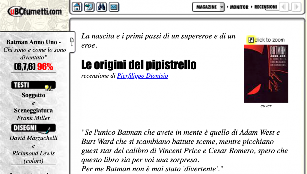 […] Ai testi troviamo l’arcinoto Frank Miller impegnato in questo complesso e oneroso (ma anche onorevole) progetto di restyling del personaggio. Per l’occasione Miller fortissimamente volle il supporto grafico di David Mazzuchelli, già compagno di quel “Daredevil: Born Again” (“Devil: Rinascita”) che narra ed illustra la bellissima e crudele distruzione interiore e risalita dal baratro del cornetto rosso della Marvel [cfr. l’articolo relativo].