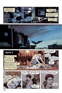 Proprio quest’ultima, nella fattispecie Gotham City, viene sadicamente introdotta dalle riflessioni di Gordon, rigorosamente in didascalie, in questo modo: “Da quassù scorgo soltanto maestosi edifici e grandi distese di cemento. Frutto del sudore di uomini ormai morti da svariate generazioni”. Anche Bruce Wayne si rivolge in modo simile alla città, quando perlustra uno dei quartieri più malfamati, quell’East End che equivale ad un Hell’s Kitchen di Devil: “Sono stato squadrato con avidità dai ragazzi vestiti di pelle stazionati a Robinson Park. Mi sono fatto largo tra le implorazioni e le minacce dei tossici del Finger Memorial. Ho attraversato la discarica di rifiuti umani sostante davanti alla missione Sprang”.