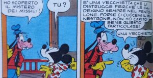 Nocciola, esasperata dallo scetticismo di Pippo, gli spiega come stanno le cose: è lei che sta distruggendo i missili, perché questi a loro volta distruggono i pentoloni con cui lei e le sue colleghe fanno il loro sabba infernale sulla Luna. Da buon amico, Pippo va subito a rassicurare Topolino di non preoccuparsi più dei missili perché lui ha risolto il mistero. La reazione di Topolino è seria e incredula (“Tu?”), e pertanto comica per chi legge: può forse accettare il primattore che gli venga rubata la scena? Tuttavia, una volta ascoltata l’improbabile spiegazione di Pippo (“È una vecchietta che li distrugge perché le cadevano sempre nel pentolone. Forse ci cuoceva il minestrone, non ho capito bene questo particolare!”), Topolino non potrà che limitarsi a congedarlo con pazienza per poi commentare tra sé e sé “Non c’è niente da fare! Pippo ormai non è più recuperabile!”