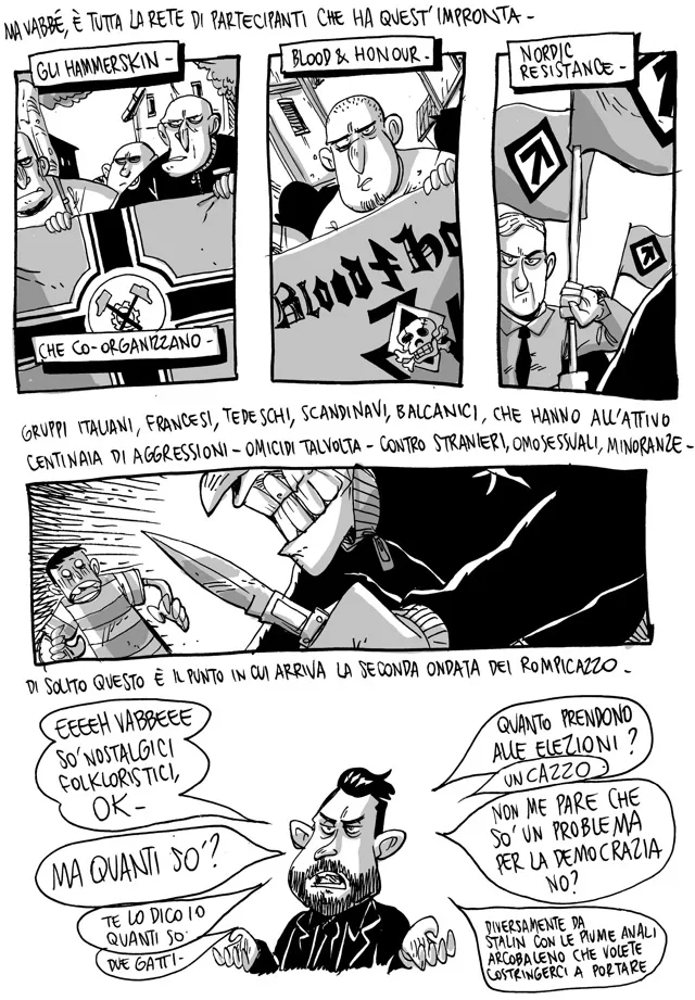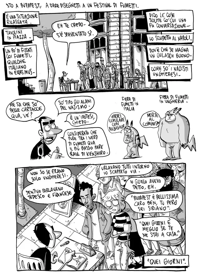 Zerocalcare, come anticipato, prima di raccontarci di Ilaria, si impegna (in maniera esaustiva e con sorprendente stringatezza) a spiegarci prima il contesto socio-politico della vicenda e, subito dopo, la vicenda giudiziaria di Ilaria. Un racconto complesso, preciso e chiaro. Ma soprattutto un discorso ponderato. Perché, come detto, Zerocalcare è un funambolo. Così per i primi due capitoli (su tre) fa l’impossibile per non scadere in giudizi qualunquisti e commenti facili (che verrebbero anche naturali) nei confronti di un’ideologia politica – quella neonazista – sempre più diffusa e radicalizzata oggi in Europa e nei confronti di una politica – quella di Viktor Orbán – sempre più agghiacciante.