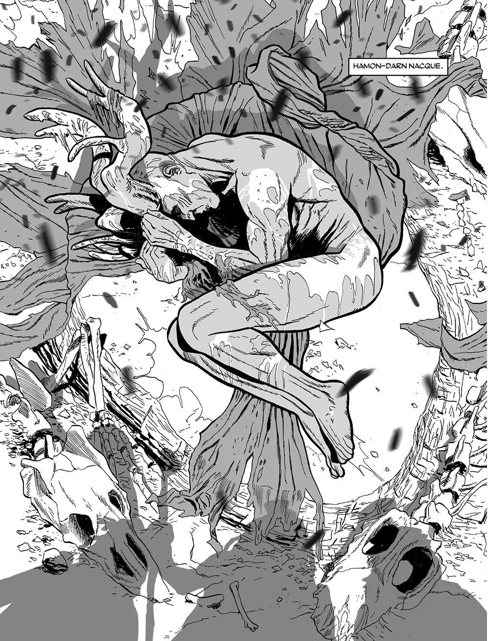 Concludo passando in rassegna lo svolgimento della storia. Luca Lamberti e Leonardo Cantone utilizzano il topos narrativo del viaggio per far svelare, tramite il racconto di Leena, la vera storia del tiranno Hamon-Darn che mise a ferro e fuoco il continente Theia. Scopriamo quindi come è “nato”, l’evento che lo ha consacrato come un Dio agli occhi di alcune popolazioni, le sue abilità da conquistatore e stratega, perché venne deposto e, soprattutto, la sua NON morte!