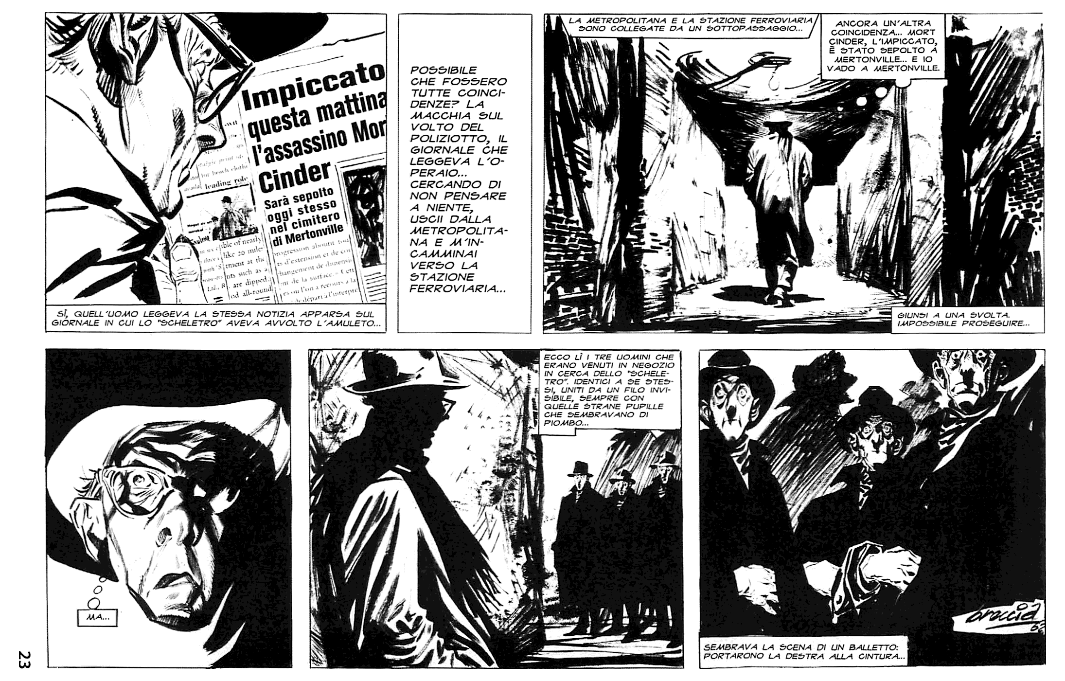Ed è questo che più mi ha colpito in Mort Cinder rispetto all’altro personaggio immortale delle historietas, quel Gilgamesh di Wood & Olivera perennemente impegnato a “salvare il mondo” in una serie di episodi sì trascinanti ma spesso al fianco di personaggi noti e all’interno di situazioni in cui il suo intervento cambiava (o stava per cambiare) la Storia, fino poi alla partenza dalla Terra distrutta su un’astronave, con dodici neonati, per salvare ciò che resta dell’umanità… Niente di tutto questo nelle avventure di Ezra e Mort, nessuna spiegazione di come il protagonista è diventato immortale, nessuna “missione” da perseguire per salvare il mondo: solo belle storie illustrate da disegni fantastici e volutamente inquietanti, talvolta di non immediata leggibilità eppure imprescindibili alla riuscita di questo capovaloro. Buona lettura.