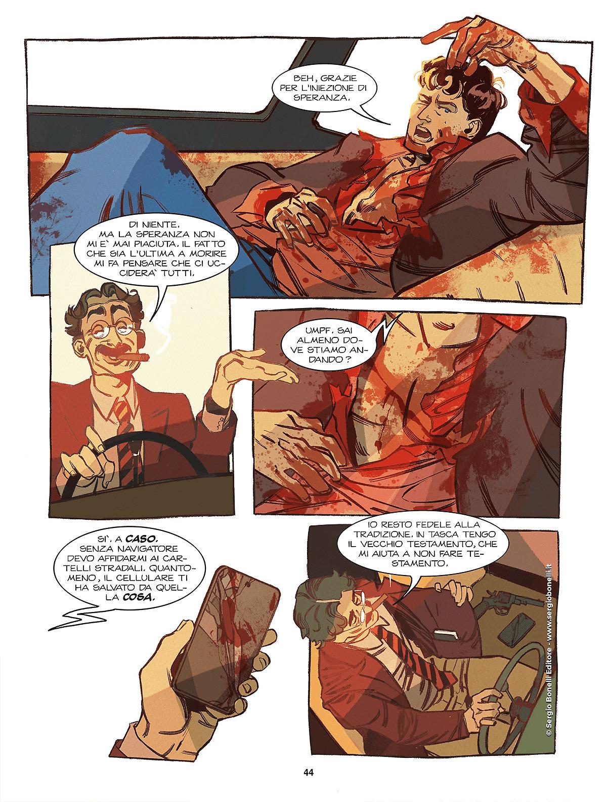 Marco Nucci è ormai un habitué dei Color Fest (e questo mese ha fatto il suo esordio anche sulla serie regolare) e anche in questa breve storia, come nella precedente Qualcosa di rosso (DDCF45), gioca abilmente con le atmosfere, con le suggestioni e con un Dylan nostalgico che ricorda il pensieroso Indagatore sclaviano, pur confezionando una storia che non riesce a spiccare come vorrebbe.