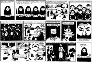 Persepolis è un capolavoro: e lo è tout court, non perché costituisce un pamphlet contro un regime totalitario e oscurantista. Lo è perché l’autrice tiene una sorta di diario che mostra la Storia attraverso la sua storia personale, senza tirate o spiegoni, con passaggi talvolta divertenti e sarcastici nonostante la gravità di alcune situazioni in cui si ritrova in prima persona. Soprattutto, la trama di Persepolis è imprevedibile: dopo i primi due libri ambientati a Teheran, il lettore non sa letteralmente cosa aspettarsi dal soggiorno in Austria e tanto meno dal rientro in patria, né sa come Marjane arriverà al “lieto fine” che mostra il suo addio all’Iran.