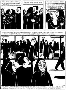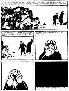 Per quanto riguarda i disegni, la scelta stilistica dell’autrice è molto particolare e non sono pochi i lettori che ho sentito lamentarsi dell’eccessiva “povertà” del suo tratto. Ma come faceva giustamente notare Vincenzo Oliva nella sua recensione dell’opera seconda della Satrapi, Taglia e cuci, i personaggi sono comunque espressivi senza alcun compiacimento grafico, con il segno posto al servizio della storia narrata: “semplicità ed essenzialità, secondo la lezione di David B. di cui la Satrapi ha saputo far tesoro”. Un punto di vista che condivido appieno, forse con l’unica riserva dei casi in cui vengono raffigurati personaggi che piangono (come nel “lieto fine” di cui parlavo): ma, nel complesso, l’abbinamento tra testi e disegni è talmente forte che non saprei immaginarmi la stessa storia disegnata in modo diverso – proprio come non saprei immaginarmi il Maus di Spiegelman disegnato con personaggi realistici al posto di topi, gatti e maiali.