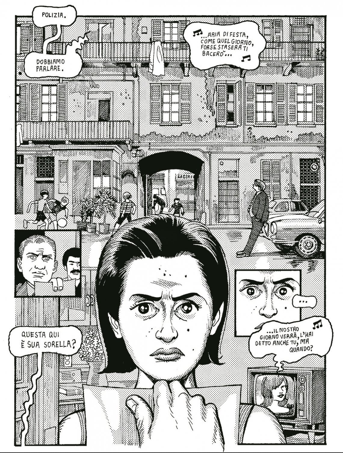 Lo stile grafico è uno dei punti di forza del fumetto: il tratto dettagliato e incisivo, unito a un sapiente uso del bianco e nero, contribuisce a ricreare l’atmosfera cupa e soffocante della metropoli lombarda. L’impianto visivo, quindi, si alterna tra inquadrature cinematografiche e vignette ricche di dettagli, immergendo il lettore in una narrazione densa e coinvolgente. Gli stessi balloons, che sono una caratteristica visiva di Bacilieri, a tratti risultano ben gestiti, spesso “a cascata”; altre – invece – sono ridondanti e confusi, distraendo dalla lettura.