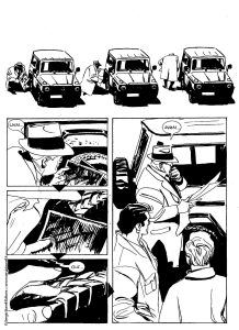 Le indagini vertono sull’omicidio di Helen Curtiss, il cui corpo viene proprio ritrovato al Central Park. Quando la scientifica, tramite il corpulento e sovrappeso Bowmann, individua una macchina potenzialmente sospetta (in quanto le tracce degli pneumatici sembrano combaciare), sono efficacissime le soluzioni trovate da Milazzo: un’unica vignetta in alto alla pagina senza lettering, con una jeep ferma e Bowmann che vi gira intorno. È un’azione in tre atti, quindi a rigor di logica avrebbero dovute esserci tre vignette separate dal loro rispettivo lettering. Questa soluzione dà maggior continuità e suggerisce in maniera ancora più netta e fluida sia il passaggio del tempo, sia la rapidità con cui esso trascorre.