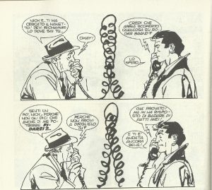 Stessa cosa quando Milazzo immortala una telefonata tra Art che si trova nel suo ufficio e Nick che invece è fuori. Noi sappiamo che i due si trovano in due luoghi diversi ma Milazzo ce li raffigura quasi uno di fronte all’altro, separati dal filo del telefono arricciato e tracciato con veloci tocchi di pennello. Anche qui: spazio, tempo e velocità d’azione sono riassunti alla perfezione.