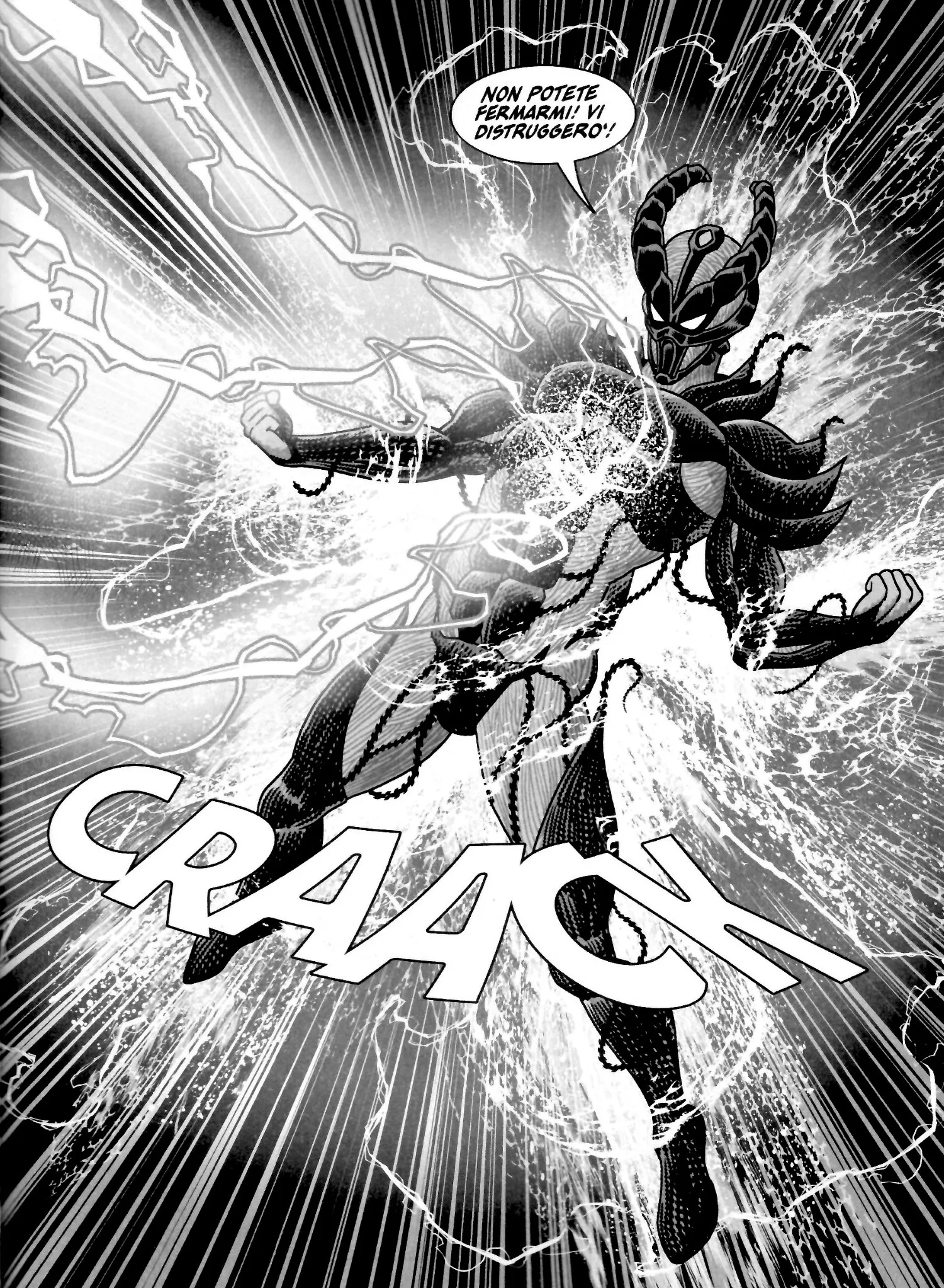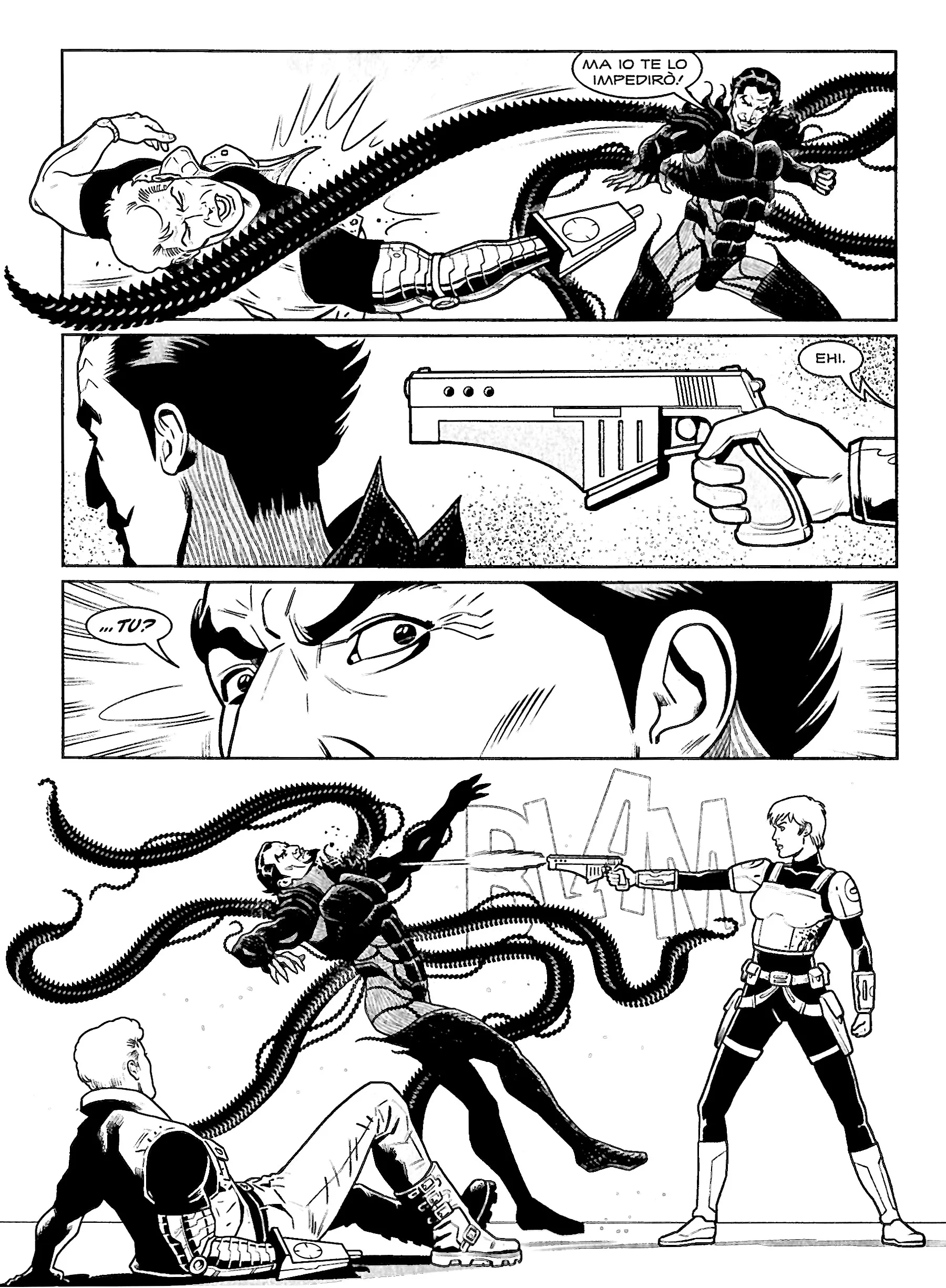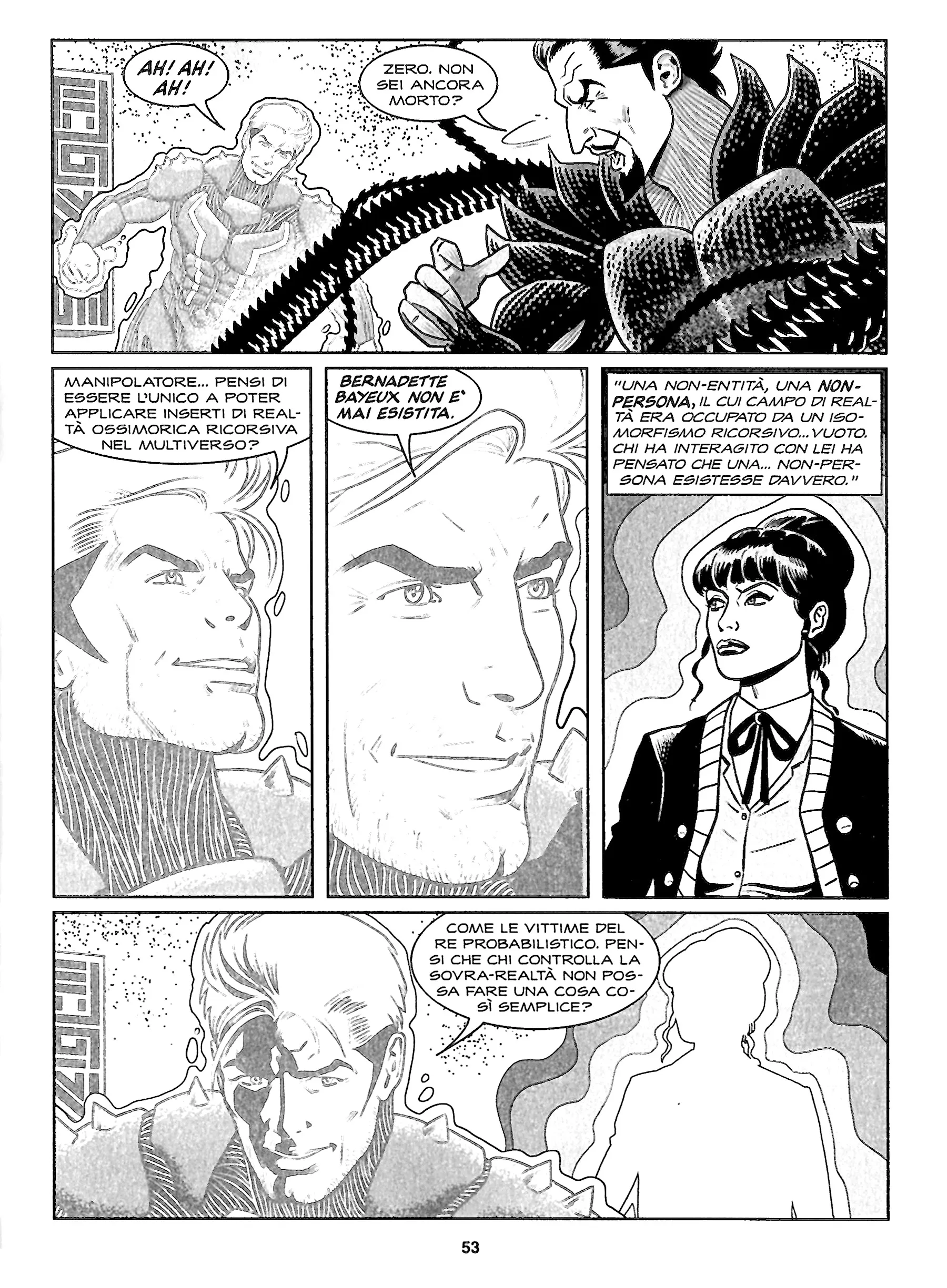 Interessante è il contributo di De Biase, che si concentra su due quest parallele: da un lato i quattro della sovra-realtà selvaggia si trovano a testare la loro tenuta come team contro un cosiddetto trascendente; dall’altro la squadra capeggiata da Nicole attraversa il loro Stargate per affrontare una non meglio specificata minaccia – che si rivelerà essere un altro trascendente. È un tratto plastico, capace di rendere un’idea di dinamismo più marcata rispetto a quella dei vari Cuffaro, Giordano e Giardo, anche grazie ad una lettura della tavola che alterna echi di manga con altri dal taglio più cinematografico. L’uso delle mezzetinte rafforza poi l’idea di ambiguità che comunque soggiace alla psicologia dei personaggi: al di là di quanto già detto per Helios, in quel particolare momento della vicenda il giudizio su Zero è ancora di là dall’essere sciolto – sia da parte degli altri comprimari, che del lettore stesso.