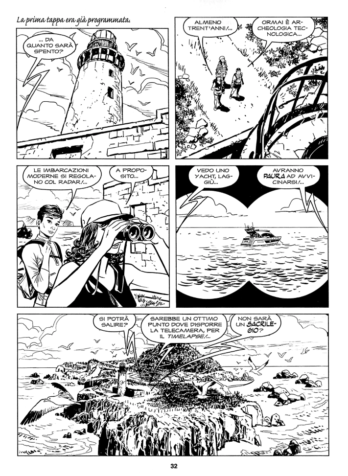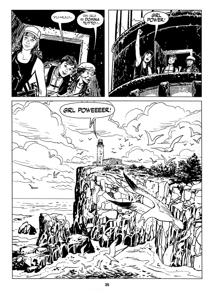 È il caso di questo L’isola del faro, numero datato marzo 2025, con Berardi autore del soggetto e della sceneggiatura in coppia con Lorenzo Calza per i disegni di Claudio Piccoli. Nuova location: niente Garden City, si parte per Temple Island, uno sperduto scoglio al largo del New England, sede di un carcere ormai abbandonato da tempo, di un convento e di un vecchio faro in disuso. Nuovo scenario: stavolta non ci sono omicidi e cacce ai criminali, soltanto un reportage fotografico sulle bellezze naturali dell’isola commissionato a Norma da una nota rivista. Nuova formazione: per l’occasione il coach Berardi manda in campo un trio inedito, con Julia che accompagna la sorella in qualità di assistente per il servizio assieme alla domestica Emily. Una vacanza rigenerante per sole donne, senza uomini tra i piedi, in perfetto stile Thelma e Louise, il film di maggior notorietà sul tema, anche citato esplicitamente nell’albo.