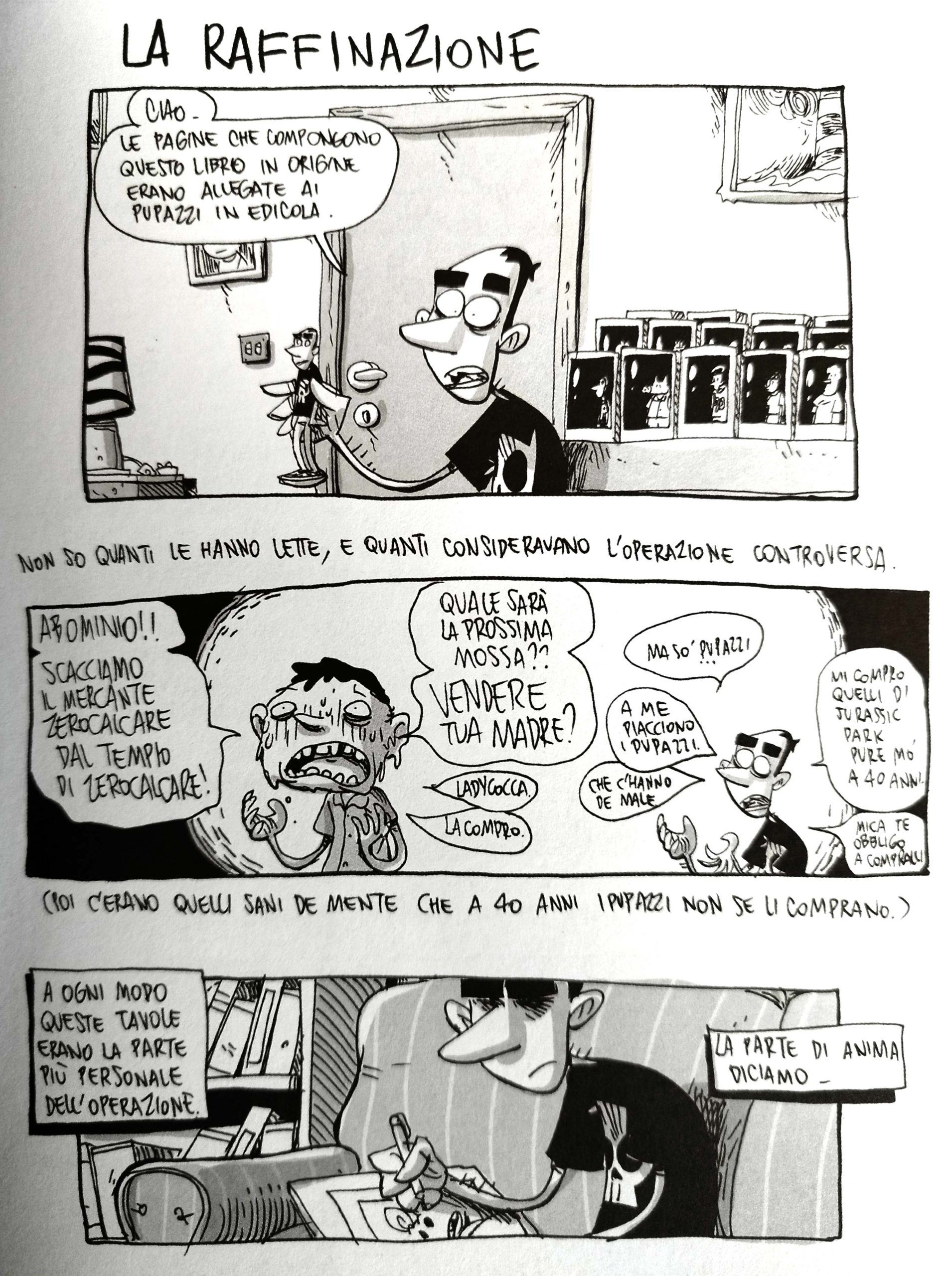 Se l’operazione in sé – come lo stesso Zerocalcare afferma nella piccola storia – ha un senso per i “fan” (non lo metto in dubbio), dall’altro lato c’è, purtroppo, una caduta di coerenza (almeno per il sottoscritto) della professionalità di Michele Rech. Era già stata ardua la scelta di lanciare delle statuette, figuriamoci poi trarne un volume.