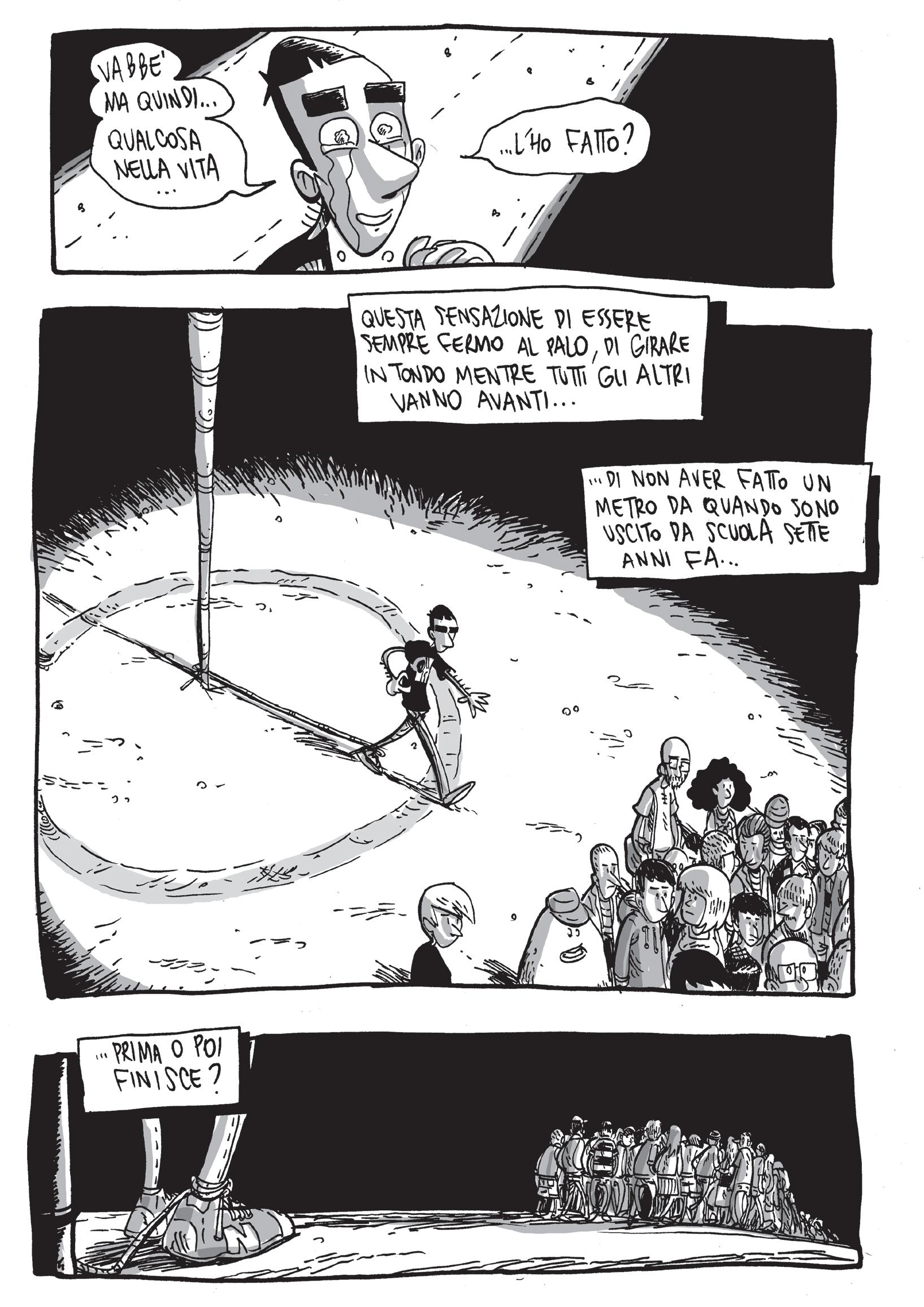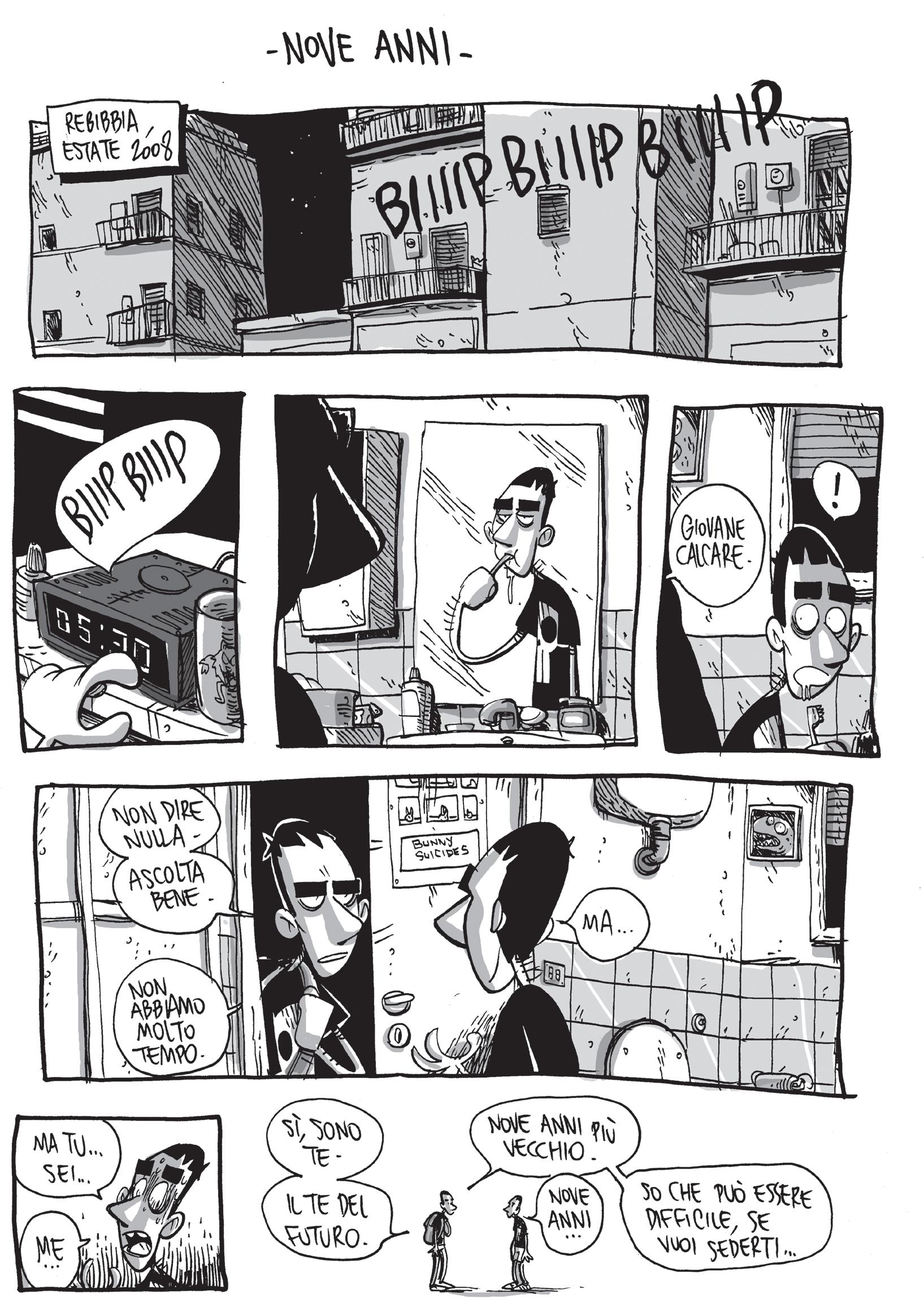 Il nostro protagonista è un uomo tormentato, non sa neanche lui bene per cosa, ma sente di non star davvero facendo di tutto per cercare di comprendere questo “perché”. Sa di doversi interrogare ma non riesce mai realmente a trovare risposte ai suoi dubbi (o forse non vuole). Calcare allora parla, pensa e riparla ancora; parla di se stesso, con se stesso, con l’Armadillo, con i suoi amici, con i vicini, con i fantasmi del passato, con Camille, con chiunque! Ed è per questo che tutto l’albo è così frenetico, eterogeneo nelle sue parti; eppure, mai dispersivo o fastidioso per chi legge. La modalità espositiva dei traumi di Calcare non è quindi ordinata e schematica; essa ricorda invece innanzitutto un voler “sputare fuori” i propri problemi, raccontandoli così come gli passano per la testa. Ciò non toglie, comunque, che egli non abbia un pensiero fisso che lo guida: fare i conti col tempo che passa inesorabile e col suo atavico immobilismo; bensì, sottolinea il bisogno di Calcare di doversi prendere continue pause di divagazione per “ricaricare” le forze per esporlo dato che questo pensiero, sotto sotto, lo logora profondamente. Ecco spiegate allora le lunghe parentesi usate per raccontare cose che solo apparentemente non c’entrano con l’argomento principale del discorso (che qui non si rivela per scelta ma che Zerocalcare presenta già nelle primissime pagine del fumetto).