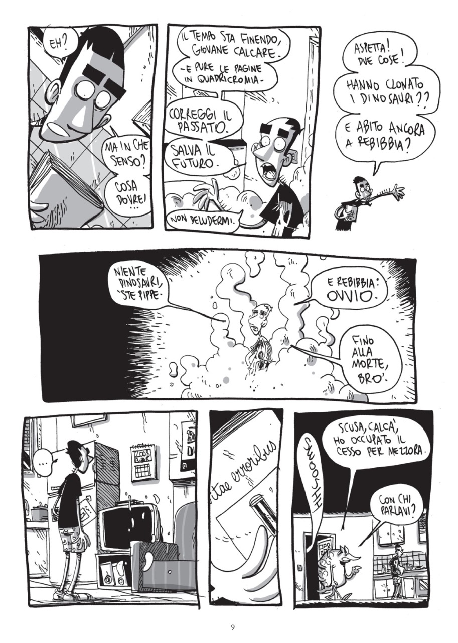 Questa forma narrativa fa però sorgere immediatamente una questione. Se da un lato la dinamicità dei discorsi “pindarici” che Calcare ha tra sé e sé non può che farci sorridere, dall’altro è forse possibile intravedere proprio qui il lato veramente problematico del protagonista stesso: il suo egocentrismo. Calcare si fa domande, si arrabbia, ride (raramente), pensa e fa altre mille cose contemporaneamente ma sempre e unicamente con se stesso e in se stesso. Paradossalmente, parla da solo anche quando si interfaccia ad altri personaggi, dato che questi o sono da lui mutati, plasmati, in animali o individualità famose oppure sono manifestazioni della sua coscienza. Comprensibilmente, ci pare difficile credere che egli riuscirà a raggiungere una ben che minima conclusione al suo interrogarsi, poiché gli manca materialmente un contraddittorio che possa contestare attivamente il suo pensiero. Eppure, proprio questo suo movimento a spirale discendente dentro di sé ci rende la figura di Calcare così terribilmente vicina, fino a stimolare in noi una sensazione di divertimento e spensieratezza che regge per quasi tutta la durata della lettura. È come se, guardando Calcare struggersi e incistarsi in se stesso, potessimo quasi esorcizzare la nostra incapacità di uscire da noi per cercare risposte alle difficoltà che ci attanagliano.