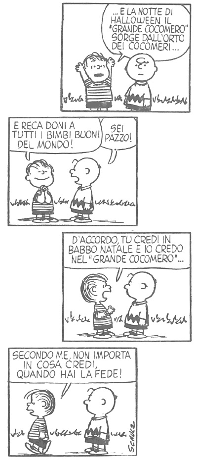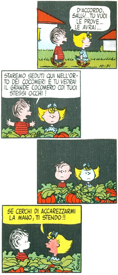 Zucca o Cocomero, resta il fatto che Linus vi ripone una fede quasi messianica e cerca di convincere anche gli altri a trascorrere la notte di Halloween nel suo orto, sperando di vederlo apparire: e quando Charlie Brown obietta al riguardo, il fratello di Lucy ha gioco facile nel proporre il parallelo con Babbo Natale, figura altrettanto mitica quanto inesistente… ma non per chi ci crede.