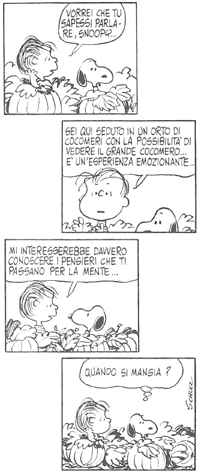 Ho parlato più volte, nelle Short dedicate ai Tascabili BUR con i Peanuts, delle strisce riservate a certi tormentoni indimenticabili che caratterizzavano i vari personaggi, a partire dai fallimenti di Charlie Brown in qualsiasi sport si cimentasse e dalle avventure di Snoopy nei panni del Grande Bracchetto o dello scrittore d’insuccesso. Ma numerose e variegate erano le situazioni, solo apparentemente ripetitive, che caratterizzavano anche gli altri: il rapporto simbiotico di Linus con la sua coperta, l’idiosincrasia di Sally per la scuola e lo studio, le avances di Lucy costantemente rifiutate da Schroeder… e chi più ne ha, più ne metta.