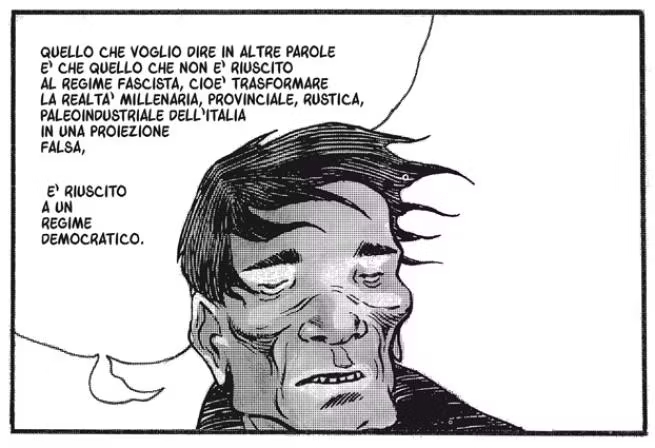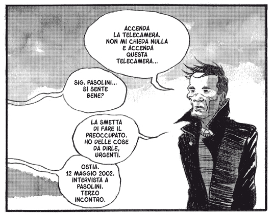 Sarà lo stesso autore del fumetto, attraverso il suo personaggio, a documentare (filmando) un viscerale Pasolini che butta fuori tutto ciò che ha da dire nei confronti della società. Questa inversione dei ruoli, quasi si volesse citare Pirandello, è una messa in scena interessante che dà diversi spunti di riflessione sulla meta-finzione dell’opera stessa.